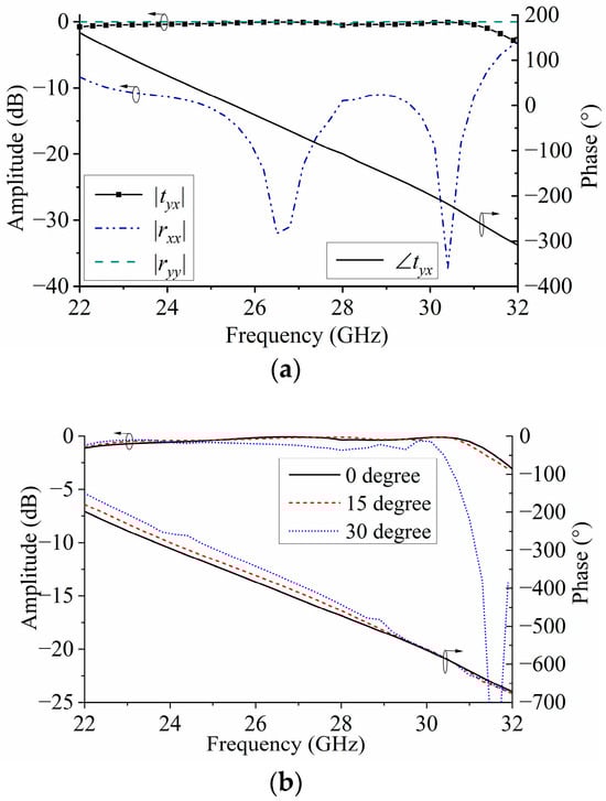 The commercial simulation software HFSS 2022 R2 was adopted to analyze the performances of the proposed TA element. The simulated results are shown in Figure 9, where |tyx| is the transmission amplitude, defined as the ratio of the transmitted electric field amplitude in the y-polarization direction to the incident electric field amplitude in the x-polarization direction. Additionally, |rxx| is the reflection amplitude, defined as the ratio of the reflected electric field in the x-polarization direction to the incident electric field in the x-polarization direction. Moreover, |ryy| is the reflection coefficient in the y-polarization for a y-polarized wave, and ∠tyx represents the transmitted phase. As seen in Figure 9a, the transmission amplitude of |tyx| is close to 0 dB, and the reflection amplitude of |rxx| is very weak, which indicates that almost all the incident waves have passed through the TA element. Furthermore, the reflection amplitude of |ryy| is close to zero, which shows that the electromagnetic wave in the y-polarization direction cannot pass through the structure and is almost reflected. Moreover, the solid black curve representing the transmission phase is almost linear as a function of frequency. It indicates that the phase linearity of the element is good, and it is beneficial to improve the TA bandwidth. Figure 9b shows the transmission amplitude and phase at the oblique incidence angles of 10°, 20°, and 30°. It can be seen that for incidence angles less than 30°, the phase error of the unit is less than 10°, and the transmission amplitude error is less than 1.5 dB.