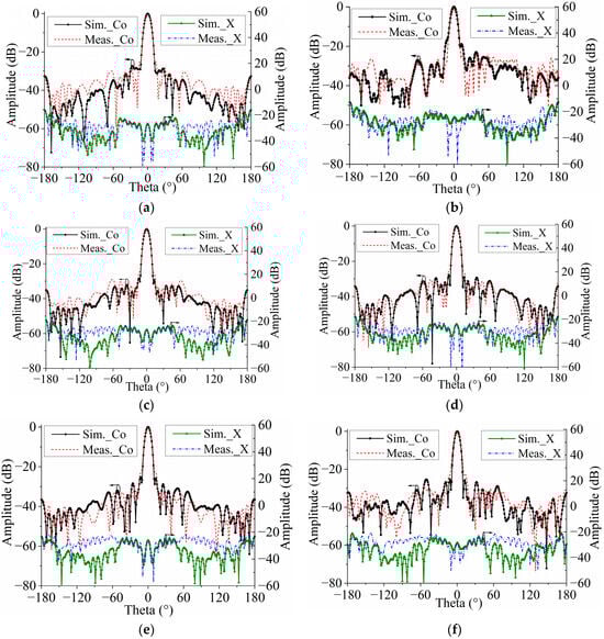 Simulated and measured normalized radiation patterns. (a) H-plane at 24 GHz. (b) E-plane at 24 GHz. (c) H-plane at 27 GHz. (d) E-plane at 27 GHz. (e) H-plane at 30 GHz. (f) E-plane at 30 GHz.