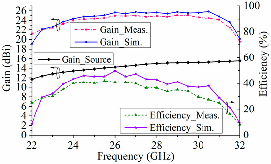 Figure 12 shows the E-plane and H-plane-normalized radiation patterns of the proposed TA at 24, 27, and 30 GHz. The sidelobe levels were below −20 dB. The cross-polarization levels were also below −20 dB in the broadside direction. The curves of the simulated and measured gain and aperture efficiency of the TA are shown in Figure 13. For a more complete characterization of the proposed metasurface-based TA, it is important to note the gain of the horn antenna used as a source. Therefore, the curve of the simulated gain of the source is also displayed in Figure 13. The value of the simulated gain was from 11.7 to 15.7 dBi within the frequency range of 22 to 32 GHz. The aperture efficiency was calculated using the ratio of the gain to the directivity coefficient of the maximum radiation direction. The differences between the simulated and measured results were mainly caused by the fabrication tolerances and assembly errors. At 29.5 GHz, the antenna had a maximum gain of 24.5 dBi and a maximum aperture efficiency of 41% at 25.5 GHz. The gain variation range of the antenna was less than 1 dB, corresponding to a gain bandwidth of 26.2% (from 23.5 to 30.5 GHz). In addition, the TA achieved a 34% 3-dB gain drop bandwidth (22.5–31.5 GHz).