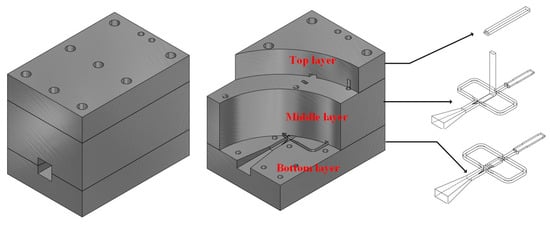 Figure 1 illustrates the designed multi-polarization horn antenna based on Boifot-type OMT, which is realized by superimposing three aluminum block layers. The bottom layer and bottom layer consist of a horn antenna integrated with Boifot-type OMT, turning waveguide, twisting waveguide and phase shifter, and the middle layer has a through-waveguide for connecting the top layer; the top layer is an E-plane turning waveguide. Computer numerical control (CNC) milling technology is employed to process the designed antenna metal mechanical processing, which lowers the final cost.