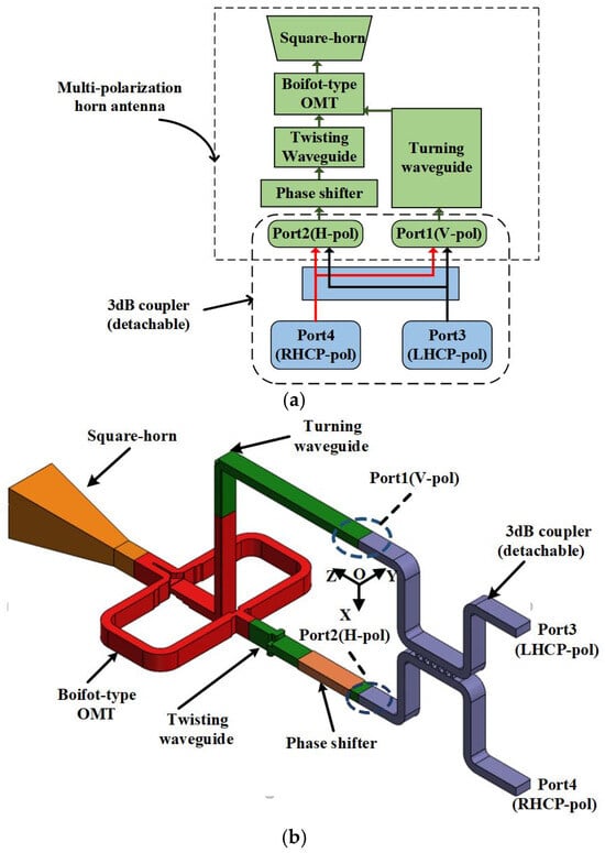 (a) Specific principal block diagram of the proposed multi-polarization horn antenna with a detachable 3 dB coupler (the directions of the arrows can be reversible). (b) Cavity structure of the antenna with a detachable 3 dB coupler.