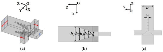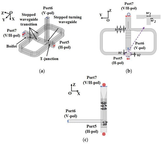 Geometries of the Boifot-type OMT. (a) Perspective view. (b) Side view in YOZ-plane. (c) Side view in XOZ-plane.