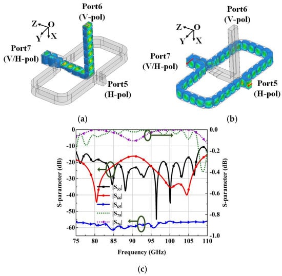 Simulated results of the OMT. (a) Electric field distributions at 92.5 GHz with Port6 as excitation. (b) Electric field distributions at 92.5 GHz with Port5 as excitation. (c) S-parameter of the OMT.