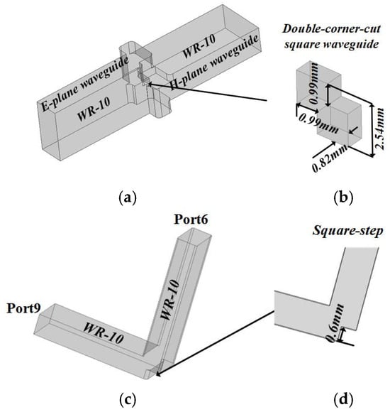 The simulated electric field distributions of the twisting waveguide at 92.5 GHz are plotted in Figure 7a. The double-corner-cut square waveguide can first rotate vertical polarization in the H-plane waveguide by 45°, then convert the 45° polarized wave to the horizontal polarization in the E-plane waveguide. Figure 7b is the simulated electric field distribution of the turning waveguide at 92.5 GHz. Through the square step, the TE10 mode wave can achieve better matching transmission in the turning waveguide. Figure 7c is the simulated transmission characteristic of the twisting waveguide and turning waveguide. In the whole W-band, the reflection coefficient is less than −20 dB, and the transfer loss is less than 0.1 dB in the whole W-band.