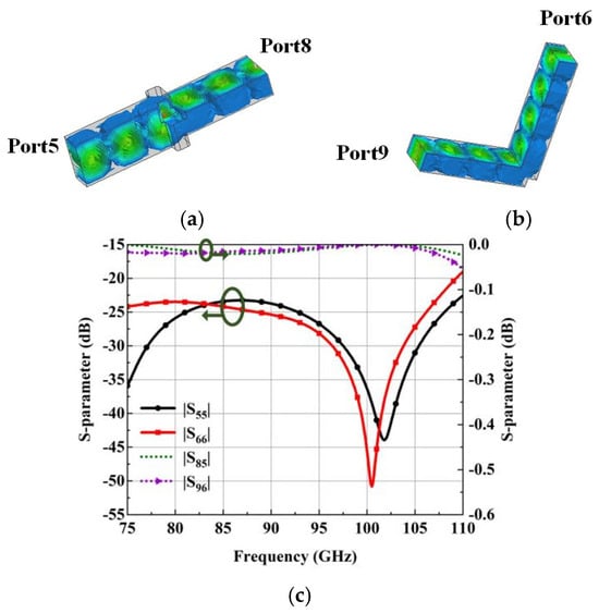 Simulated results of the twisting waveguide and turning waveguide. (a) Electric field distributions at 92.5 GHz with Port8 as excitation. (b) Electric field distributions at 92.5 GHz with Port9 as excitation. (c) S-parameter.