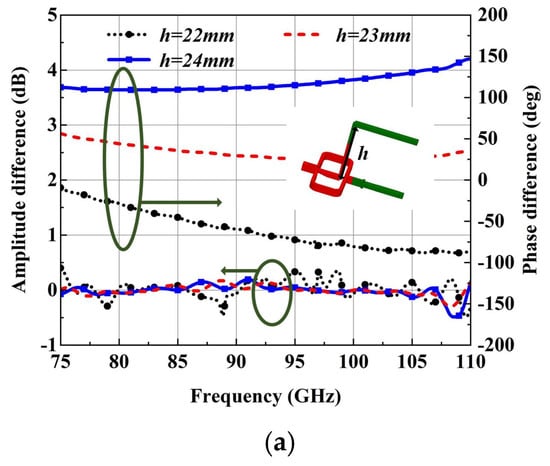 In addition to solving the problem of port plane consistency, how to realize wideband circular polarization in dual-port mode is another focus of this paper. In order to achieve broadband circular polarization, the quadrature polarized wave must first maintain a relatively stable phase difference of 0° in the whole W-band. Generally, in the OMT section, the orthogonally polarized waves produced by the OMT will have phase differences. However, the phase difference is not stable in broadband due to the different transmission paths of HP and VP waves. Parameter h, connected with a transmission path in this study in W-band, is shown in Figure 8a, which reveals the effects of the length of the VP transmission path on phase and amplitude differences. It can be seen that parameter h has a great effect on the phase difference of the orthogonally polarized wave transfer in the OMT with port plane consistency. The amplitude difference is almost unaffected and stable at (0 ± 0.5) dB, while the phase difference of the quadrature polarization wave varies greatly when h varies. Relatively steady phase difference (25–56°) performance is obtained in W-band for an h of around 23 mm. To keep the phase of the orthogonally polarized wave coinciding, a phase shifter is needed to compensate for the phase difference.