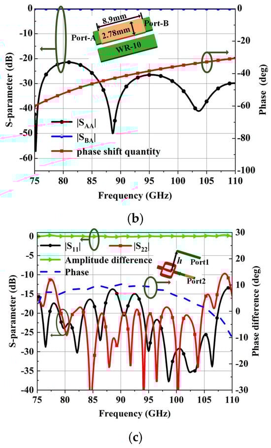 The phase velocity of the TE10 mode is determined by the wide-edge and narrow-edge dimensions of the rectangular waveguide. A phase shifter is designed by expanding the wide edge of the WR-10, which can change the phase velocity of the TE10 mode, and it can be easily integrated into the branch path. The standard rectangular waveguide WR-10 with the same transmission length as the phase shifter that is designed to compare with the phase shifter is shown in Figure 8b. It can be seen that the phase shift quantity is 40° at 92.5 GHz, and it varies with a steady trend (33–55°), which is matched with the orthogonally polarized wave phase difference in the whole W-band. Therefore, using this kind of phase shifter to adjust the phase difference of the orthogonally polarized waves can keep it at about 0° in the whole W-band. After optimization of parameter h, the simulated results are shown in Figure 8c, and it can be seen that the reflection coefficient of Port1 and Port2 is less than −10 dB in the whole W-band, and the amplitude difference of the orthogonally polarized waves is at (0 ± 0.3) dB. This suggests that the phase shifter will not damage the transmission performance of the OMT. The phase difference of the orthogonally polarized waves is at (0 ± 10°) in the whole frequency band. Based on this work, the OMT can nearly transfer the orthogonally polarized waves with constant amplitude and phase in the whole W-band.