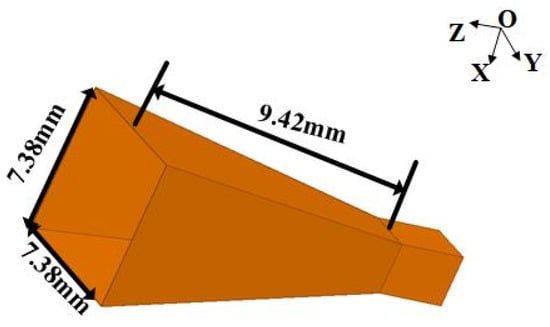 Another key component in this multi-polarization system is the radiating antenna, which can be integrated with the square waveguide. Therefore, a horn antenna is suitable for this system because it can be seen as a waveguide with an open aperture, and it still transmits TE10 (V-pol) and TE01 (H-pol) modes, which are the basic modes of square waveguides internally, and its radiation characteristic is mainly decided by the size of the aperture. The aperture size and axial length of the horn are the basic parameters to determine the gain of the horn antenna. The length of the horn is also crucial to the impedance matching of the antenna. A suitable aperture size and axial length of the horn are calculated and optimized for full W-band operation with a minimum gain of 15 dB. Considering the transmission of the orthogonally polarized waves in the horn component and the radiation performance, a horn with a square aperture (7.38 mm × 7.38 mm) is finalized, which is beneficial to keep the same amplitude and phase difference of the orthogonally polarized waves (V-pol and H-pol). The geometries of the square horn are shown in Figure 9.
