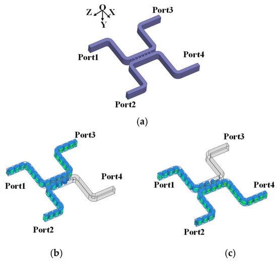 (a) Geometries of the 3 dB coupler. (b) A total of 92.5 GHz electric field distributions when Port3 is fed. (c) A total of 92.5 GHz electric field distributions when Port4 is fed.