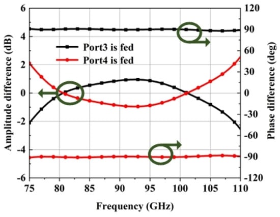 The simulated results of the coupler are shown in Figure 11. It can be seen that Port1 and Port2 will obtain signals with almost the same amplitude fluctuation within 2 dB and a ±90° phase difference in the whole W-band. Therefore, the antenna can realize LHCP or RHCP radiation in the whole W-band when fed using this 3 dB coupler.