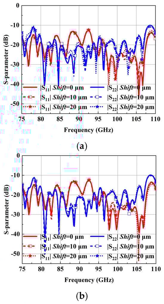 The antenna return loss. (a) Effects of bottom layer shifting errors. (b) Effects of top layer shifting errors.