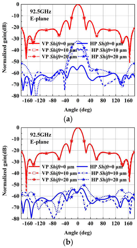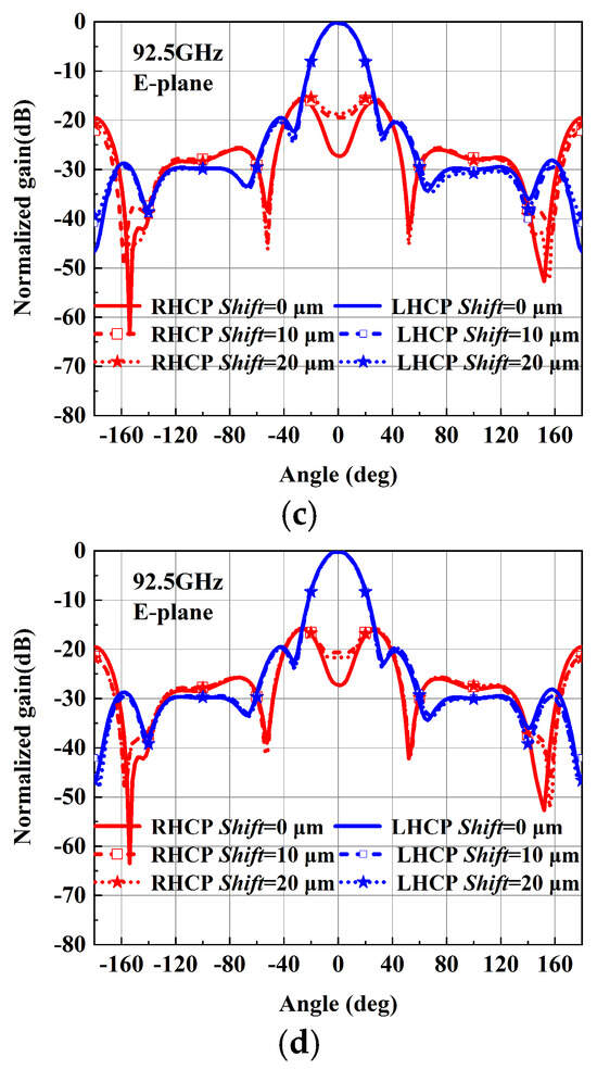 Based on the above design, the antenna integrating with Boifot-type OMT, turning waveguide, twisting waveguide and phase shifter are fabricated in a layered aluminum block using a CNC milling technique. According to the structure of the antenna, it can be vertically divided into 3-layer configurations, as shown in Figure 12; the three layers are aligned with pins and joined with screws. All the WR-10 ports are configured with a standard UG-387 flange to realize the connection with the 3 dB coupler. Considering the offsetting errors between layers has become a crucial problem in this layered structure. The simulation of layer shifting on the 3-layer antenna performance is carried out, as shown in Figure 13. A shift may exist between every block layer due to the split-block assembling; the effects of the bottom and top block shifts are simulated, respectively. However, whether the layer is moved 10 μm or 20 μm, the return loss of the antenna in the whole W-band is less than 10 dB, which indicates that the working bandwidth of the antenna is not affected by the assembly errors within 20 μm. The radiation performance is shown in Figure 14; it can be seen that the main polarization pattern of the antenna is not affected by assembly deviation, regardless of the linear polarization radiation mode or the circular polarization radiation mode. But, as the assembly deviation increases, the cross-polarization deteriorates, and the linear polarization radiation pattern shows up more clearly. However, the impact is still acceptable when the shift changes by 20 μm. Fortunately, the aligned accuracy of the pins in the current CNC-machining is less than 20 μm, which makes it clear that the approach of using CNC to fabricate complex antennas in layers proposed in this paper is feasible. It can be found by these simulations that the offset of the bottom layer has a more severe effect on the antenna radiation performance, which is worth paying more attention to when assembling.