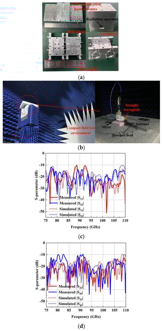 The S-parameter is measured using the Agilent N5260A Vector Network Analyzer (VNA) with an OML W-band extension module. The measured results compared with simulated results are shown in Figure 15c,d. It is found that the measured results agree well with the simulation results. The reflection coefficients of the four polarization modes (Port1 to Port4) are all better than 10 dB in the whole W-band, with a relative bandwidth of 37.8%.