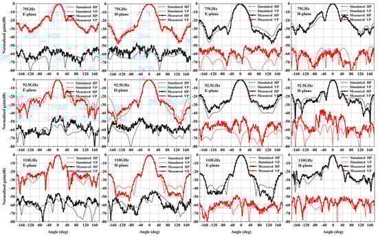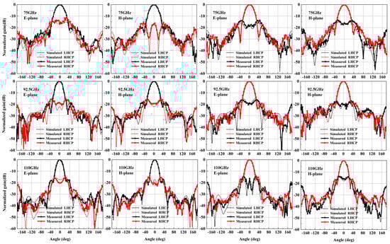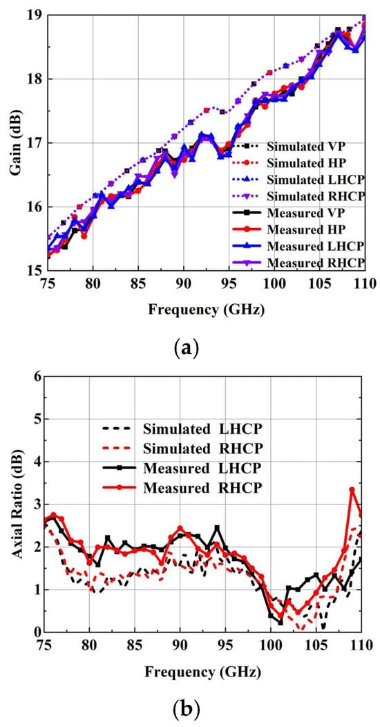 Afterward, a compact field test environment, shown in Figure 15b, is used to capture the radiation performance of the designed horn. As shown, one input port of the designed antenna is connected to the mixer through a WR-10 straight waveguide, and another port is connected to the matched load to absorb the interference signal. The signal received by the designed antenna is transmitted to the RF receiver through the mixer. All of the signal is produced by a W-band multiplier and radiates through the standard gain horn antenna. The measured normalization radiation patterns of the four polarization modes are in good agreement with the simulated results. It is seen in Figure 16 and Figure 17 that the cross-polarization for VP and HP is less than −43 dB at 75 GHz, 92.5 GHz and 110 GHz. Meanwhile, the cross-polarization for LHCP and RHCP is less than −17 dB at 75 GHz, 92.5 GHz and 110 GHz. The gain of the four polarization modes is basically coincidental due to the use of the same radiation aperture, as shown in Figure 18a; the maximum gain is 18.8 dBi, which is slightly lower than the simulated results. It is also observed in Figure 18b that the AR for LHCP is less than 3 dB in the whole W-band, and for RHCP, it is less than 3.5 dB. The measured AR is slightly higher than the simulated AR of the two circular polarization modes, possibly due to the measuring and machining errors.
