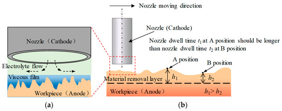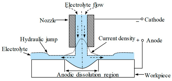 In Jet-ECM, the material removal is achieved by the mechanism of electrochemical dissolution. As is shown in Figure 1, the workpiece is connected to the anode of the power, and the nozzle is connected to the cathode. There is a small gap between the nozzle and the workpiece to discharge the electrolyte flow. When the electrolyte flow hits the workpiece surface, the electrolyte flow speeds and electrolyte flow directions change drastically. A thin electrolyte flow layer is, thus, formed. The thin layer is generated around the jet center and the thickness of the layer rises suddenly at the edge of the thin layer to form a hydraulic jump phenomenon. With the help of the hydraulic jump phenomenon, the thin layer-covered region has high resistance [25], and most of the currents are restrained in this region. Far away from the jet center, both the current density and the material removal rate (MRR) are decreased to form a Gaussian-type pit on the surface [26].
