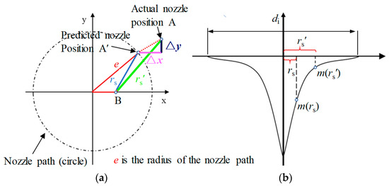 Based on the model [18,19], the machining parameters, such as nozzle traveling path and movement speeds can be calculated by comparing the initial and target surface shape of the workpiece. However, because of the installation errors and limitations in device accuracy, nozzle positioning errors arise between the actual nozzle positions and the theoretical positions. Assume that there are nozzle positioning errors (Δx, Δy) between the theoretical and actual positions in the X and Y directions, respectively. The positioning errors cause a distance deviation between the actual distance rs′ (A′ B) and theoretical distance rs (AB) (Figure 3a) and the MRR deviation ε is caused. As the distance deviation between rs′ and rs increases, the ε increases (Figure 3b):