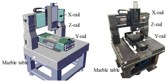 The moving parts of the mechanical devices include X, Y, and Z rails (Figure 4). The working lengths of the three rails are 250 mm, 300 mm, and 200 mm, respectively. The relative movements are achieved through the linkage control of the three rails. The electrolytic cell and the leveling devices are placed on the Y-rail. The Y-rail adopts an air-floating rail to avoid the crawling phenomenon caused by friction. The X and Y rails are driven by motors. The Z-rail uses a servo motor with a brake and a high-precision ball screw. The base of the mechanical device is made of marble, which can keep the mechanical device maintaining good accuracy.