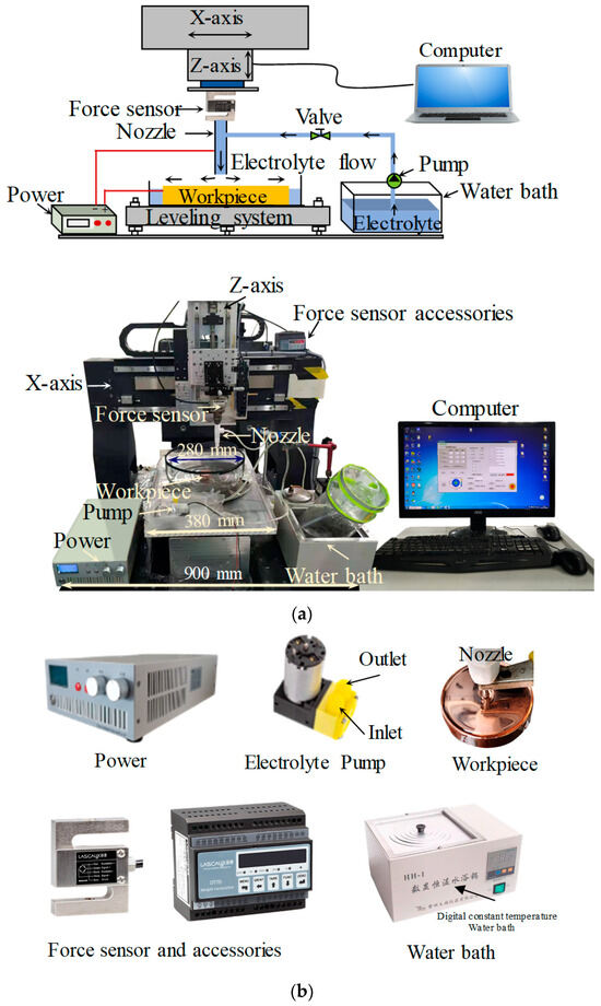 Based on the model of Section 2.3, a specific stress-free deterministic polishing system was designed. The whole system can be divided into three parts: mechanical devices, motion control systems, and accessory devices. The mechanical devices include X, Y, Z rails and motors. The workpiece is placed in an electrolytic cell, which can move along the Y-rail. The nozzle is fixed on the force sensor, which can move along the X-rail and Z-rail. The relative movements between the workpiece and nozzle are realized using the motion control systems. The accessory devices include a gap control system and an electrolyte supply system.