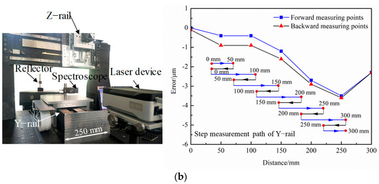 As is shown in Figure 7, the reflector is fixed on the marble platform. The spectroscope is attached to the moving part of the testing rail. During the test, the X-rail with a length of 250 mm is divided into segments. A step measurement method is adopted, which makes the trajectory look snake-shaped. First, the moving part moved from the initial position (0 mm position) of the rail to the 50 mm position and the measurement data were collected at 50 mm position. After that, the moving part returned back to the initial position (0 mm), and the measurement data were collected. Then the moving part moved from the initial position (0 mm) to the 100 mm position and the measurement data were collected at the 100 mm position. Then, the moving part moved back to the 50 mm position, and the measurement data were collected. The process was repeated, which made the moving part trajectory just look snake-shaped until the moving part arrived at the end of the X-rail (250 mm position).