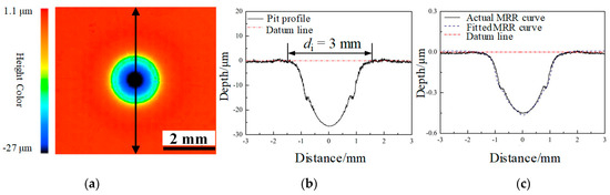 As is shown in Figure 8a, the pit can be measured using the laser confocal microscope after processing for 60 s using the parameters in Table 2. As displayed in Figure 8b, the two-dimensional cross-sectional profile of the spot is obtained. The cross-sectional profile of the pit is axis-symmetrical, and the profile range is constrained to an area of ±1.5 mm and the pit depth is 26.5 μm. The depth of the material removal decreased significantly since the distance was far away from the symmetry axis. The profile function could be fitted with the MATLAB software Curve Fitting APP (Version R2018b) to obtain the cross-sectional profile function. The MRR function can be obtained according to the profile function and the processing time.
