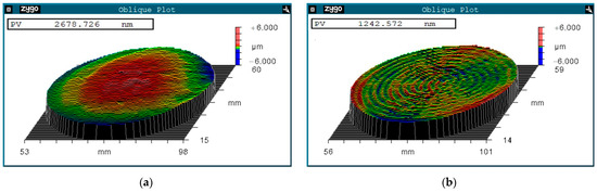 According to the processing parameters in Table 3. The processing time is 34 min. After polishing, the surface PV value of the φ 50 mm workpiece (valid dimensions = 90% of the central region) converged from 2.67 μm to 1.24 μm. The bump at the center of the workpiece (red color) is completely removed, achieving a flat surface (Figure 9b).