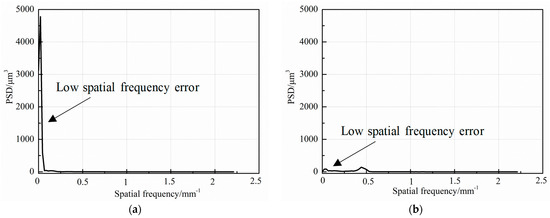 To achieve clearer and more intuitively displayed results for assessing the height distribution and characteristics of the workpiece surface (Figure 9), the power spectral density (PSD) method is applied, which can display the height distribution and characteristics of the surface more clearly and intuitively [31]. The spatial frequency from low to high corresponds to flatness, waveness, and roughness. To analyze the low frequency spatial errors of the workpiece, twenty diameters in Figure 9 at equal angles were chosen for PSD calculation. The calculated PSD data were averaged for a more accurate assessment. As shown in Figure 10a, before the specific stress-free deterministic polishing, the low frequency spatial errors of the workpiece surface are significant. After the stress-free deterministic polishing, most of the low frequency spatial errors are eliminated, which means the surface flatness is significantly improved, as shown in Figure 10b.