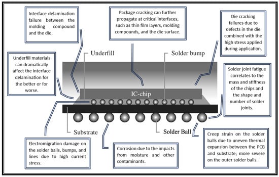Flip-chip packaging assemblies include a wide range of vulnerabilities. Figure 2 summarizes common failure modes in flip-chip packages. The effects of these failures are generated using different stress modes, as will be detailed in the following sections.