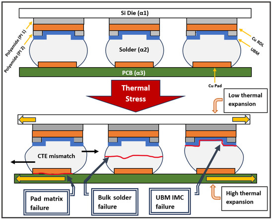 Since electronic devices consist of a large range of different materials, such as metal, composites, polymers, and ceramics, the thermal expansion of the materials is prone to causing various forms of damage. A prime example is sheer strain in solder joints. Solder joints are subjected to mechanical stresses and strains due to mismatches in the coefficients of thermal expansion (CTE) between the different materials. Components in devices are made up of a variety of materials which have different coefficients of thermal expansion [22]. When a device is switched on and off, it experiences thermal stress, leading to shear stresses, as is demonstrated in Figure 3 between the top and bottom diagrams. Solder joint fractures are categorized according to their modes of failure. Darveaux et al. and Zhao et al. identified three major modes of solder joint failures for (BGAs) [23,24]. The lower solder joint diagram in Figure 3 illustrates the modes as follows: