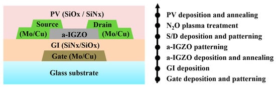 - Choi, S.-H.; Han, M.-K. Effect of deposition temperature of SiOx passivation layer on the electrical performance of a-IGZO TFTs. IEEE Electron. Device Lett. 2012, 33, 396–398. [Google Scholar] [CrossRef]