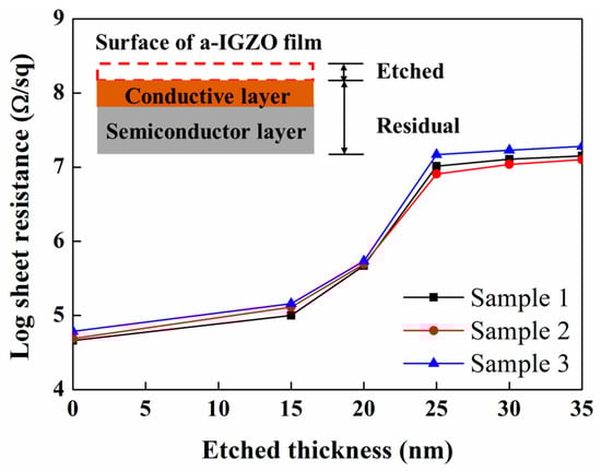 To clarify the depth distribution of the generated Vo defects caused by the sputtered deposition of S/D metal, we evaluated the Rs depth profile of a-IGZO film-4 in Table 1. The surface of a-IGZO film was repeatedly etched in dilute hydrochloric acid [25] to obtain the thin film. Figure 2 shows the Rs values of the residual a-IGZO film with various etched thicknesses, and the inset shows the schematic cross-section of the residual a-IGZO film after being etched in dilute hydrochloric acid. The Rs values of the residual a-IGZO film were measured after each etching step. The Rs value of the a-IGZO film-4 is initially about 104 Ω/sq and increases as the etched thickness increases. When the etched thickness is over 25 nm, the Rs value is about 107 Ω/sq and nearly remains constant with a further increase in the etched thickness. Obviously, the remarkable increase in Rs from 104 to 107 Ω/sq should be ascribed to the significant difference in conductance between the surface and bulk of the a-IGZO films, instead of the 30% decrease in film thickness. These results suggest that a high density of Vo defects are distributed within approximately 25 nm of the surface of the a-IGZO films. In addition, the high Rs value of around 107 Ω/sq of a-IGZO film-5 shown in Table 1 should be attributed to the removal of the Vo defects in the surface layer by the F-containing etchant, which has a relatively high etching rates of 0.4 nm/s and could remove the surface layer of a-IGZO film after removing the S/D metal films by means of over-etching.