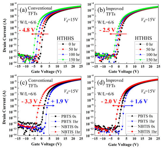 (a,b) Evolutions of transfer characteristics of the conventional and improved a-IGZO TFTs under HTHHS conditions. (c,d) Transfer characteristics of conventional and improved a-IGZO TFTs before and after PBTS/NBTIS stress.