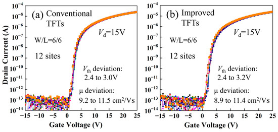 To further compare the uniformity of the electrical characteristics of the conventional and improved TFTs, the transfer characteristics of the 12 fabricated TFTs on a G4.5 glass substrate were measured. As shown in Figure 5, for the improved TFTs, the Vth and mobility (μ) deviations are 0.8 V and 2.5 cm2/Vs, respectively, while for the conventional TFTs, they are 0.6 V and 2.3 cm2/Vs, respectively. The results indicate that removing the surface layer of the back channel by means of wet etching using F-containing copper etchant does not cause significant deterioration of the uniformity of electrical characteristics.