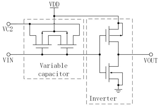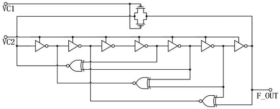 Figure 3 depicts the comprehensive circuit of the voltage-controlled oscillator (VCO) proposed in this research. The VCO comprises three five-stage loops and one seven-stage loop, which are constructed using inverters, variable capacitors, and XNOR as fundamental components. As depicted in the diagram, the seven-stage loop represents the slowest loop configuration, consisting of seven delay units. The system consists of one MOS tube and a five-stage loop, which is comprised of five delay units and one XNOR.