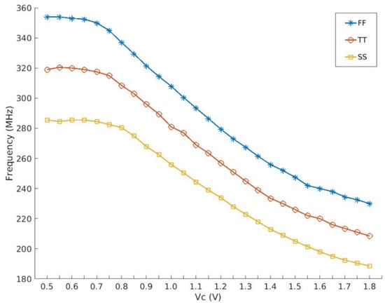 The symbol represents the output frequency. When the control voltage is equal to zero, the difference between the maximum and minimum values of () represents the range of variation. Additionally, K denotes a constant value. It is evident from the equation that a significant value of can be achieved, enabling precise control over the output frequency by manipulating a small variation in the voltage . The characteristics of MOSFETs exhibit significant variations across different wafers. To mitigate challenges in circuit design, process engineers strive to ensure that device performance falls within a specified range. Roughly speaking, the expected parameter variation is tightly controlled within the maximum range that the chip’s performance envelope can tolerate. The range of performance typically provided to the designer is referred to as a “Process Corner”. Figure 6 illustrates the KVCO achieved through the simultaneous adjustment of VC1 and the fixation of VC2. As depicted in Figure 6, the three curves FF (blue), TT (red), and SS (yellow) correspond to Fast NMOS Fast PMOS, Typical NMOS Typical PMOS, and Slow NMOS Slow PMOS, respectively. In addition to the aforementioned three corners, it is also necessary for the three curves (FF, TT, SS) depicted in the figure to satisfy the requirements of voltage and temperature in order to establish PVT (process, voltage, temperature) conditions. The voltages are 1.8 V with a tolerance of +10%, 1.8 V, and 1.8 V with a tolerance of −10%, respectively. The recorded temperatures were −20 °C, 25 °C, and 80 °C, respectively.