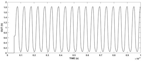 Figure 7 illustrates the experimental results obtained from the output ports of the voltage-controlled oscillator (VCO) under the conditions where VDD and Vc are set to 1.8 V, where the output oscillation frequency is 32 MHz. Table 1 presents the dimensions of the CMOS that comprises the multi-path VCO element. The VCO circuit demonstrates several advantages, such as stability, high output frequency, and multi-stage output achievement.