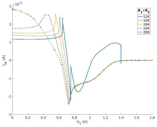 In this study, the design of a nonlinear resistance is achieved by utilizing two operational amplifiers, five resistors, and one capacitor, as depicted in Figure 8. Figure 9 and Figure 10 depict the current–voltage characteristic curves when the resistance or ratio of and is altered, respectively. The data demonstrate that the second current–voltage characteristic curve remains unaffected by the two parameters. The impact of varying total resistance values on the curve is evident in terms of curve stability, the rise and fall time of the first half peak, and the maximum value. The differential ratio influences the positioning of the first half of the current peak.