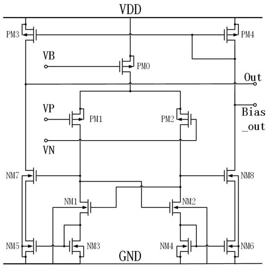 OTA refers to an integrated circuit that serves as a high-gain voltage amplifier specifically designed for differential-mode input, typically differential-in, single-ended output []. Its main function is to amplify the voltage difference between two input voltages []. The circuit is designed to operate efficiently under low-voltage conditions, ensuring a high output despite minimal input. The OTA proposed in this paper is depicted in Figure 11.