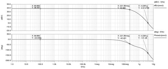 Table 2 presents the width-to-length ratio of the transistors in the OTA. According to the table, the width-to-length ratio of transistor PM0 is larger. This can be attributed to the fact that PM0 serves as the tail current source in the circuit, and the current passing through PM0 is the cumulative total of the differential circuit. Figure 12 presents the characteristic curve of the OTA amplitude–phase margin. The cascade OTA circuit exhibited a gain (20 lg (Av)) of 38.507 dB, a phase margin (r) of −131.28°, a 3 dB bandwidth of 221.65 MHz, and a gain–bandwidth product (GBW) of 4.23 GHz. The experimental results indicate that the power supply voltage (VDD) and the control voltage (Vb) were measured at 1.8 V and 1.2 V, respectively.