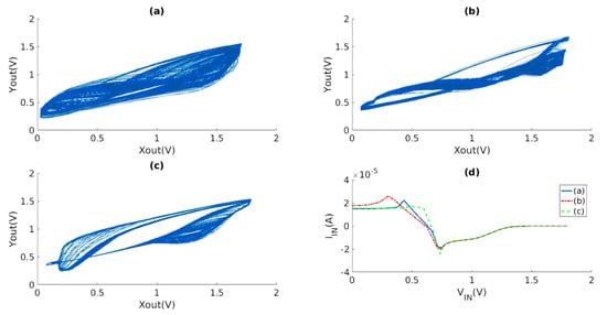 Figure 14d depicts the current−voltage characteristics of the three nonlinear circuits under consideration. Comparing the phase diagrams and Lyapunov exponent, it is evident that, despite the apparent complexity of the phase diagrams, the Lyapunov exponent does not necessarily exhibit high values. This can be observed in Figure 14a,c. Therefore, it can be concluded that the requirement for achieving a chaotic response extends beyond the mere adjustment of coupling device parameters between the VCO and nonlinear resistors. Generally, the adjustment of parameters has the ability to alter the state of a system. This is analogous to modifying the values of various components in a circuit, including resistance, capacitance, and even bias voltage, in order to achieve desired outcomes. The observation of a phase diagram can provide an indication of the presence of chaotic behavior, but it cannot be considered as a conclusive method for determining the complexity of chaotic phenomena.