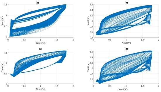 The phase diagrams of different − responses under experimental conditions are presented in Figure 15. In these experiments, the values of capacitance and the resistor were kept constant, while the frequency of the VCO was fixed. However, the values of and were varied. Comparing Figure 15b,c, it is evident that distinct resistance values have the potential to produce analogous chaotic phase diagrams. Figure 15c,d shows that only the resistance value of was modified, which varied from 20 k to 30 k. As a result, the chaotic phase diagram displayed consistent alterations.