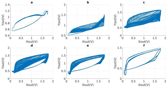 Phase diagrams depicting various − relationships are presented in Figure 14, each corresponding to different parameter settings. Figure 14 illustrates the phase diagrams for three different scenarios. In the first scenario (a), the values of the resistors and capacitors are as follows: = 7 K, = 21 K, = 21 K, = 1 K, = 49 K, = 23 K, = 50 , = 800 , and Ly = 0.8685. In the second scenario (b), the values are = 3 K, = 10 K, = 10 K, = 7.1 K, = 30 K, = 16.5 K, = 200 , = 80 , and Ly = 0.6435. Finally, in the third scenario (c), the values are = 1 K, = 10 K, = 10 K, = 2 K, = 20 K, = 23 K, = 100 , = 800 , and Ly = 1.0012.