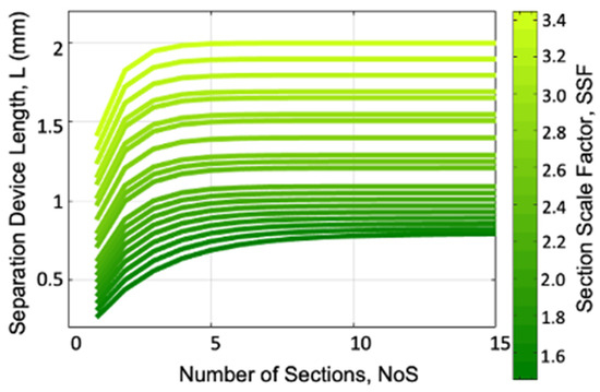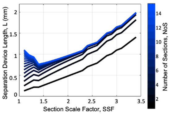 Figure 3 shows the relationship between the total length of the multi-size DLD device and the NoS for different values of the SSF ranging from 1.5 to 3.4 with 0.2 steps. This plot shows that the L increases with both the NoS and SSF, as expected. However, the L saturates for an NoS larger than ~5–10. This reflects the fact that, due to scaling the gap size down, the length of each subsequent section is smaller and smaller, allowing the total length to reach a saturation point that varies with the SSF.