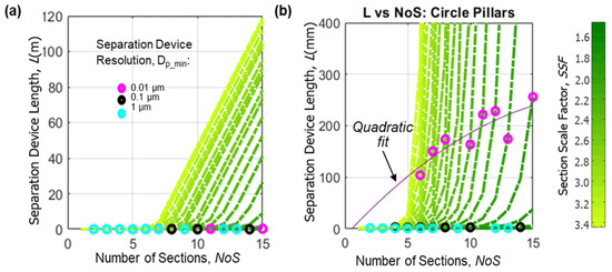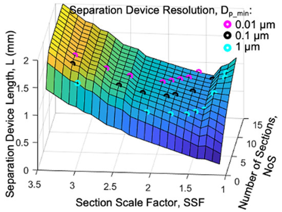 The externally balanced cascade multi-size gap-scaled DLD model was first simulated to see relationships and design tradeoffs without any practical fabrication limits. The device length, L, and the separation device resolution, Dp_min, were explored to define the optimal range of the total number of sections, NoS, and the section scale factor, SSF. In this preliminary analysis, because the pillar and gap size has no minimum limit, we set to 3 as a starting point, based on our previous study [26].