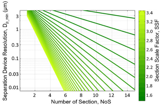 The expression in (7) allows us to define the maximum resolution (smallest separated particle size), Dp_min, for a device with NoS sections as