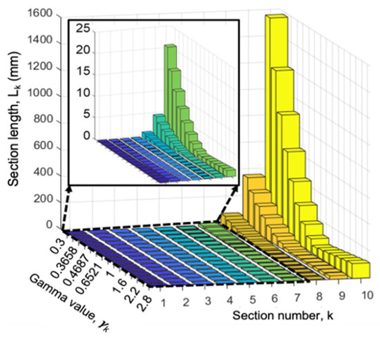 In Section 4, γ was set to a constant that was used across all sections in order to simplify the relationship among the critical design parameters of a multi-section cascaded DLD device. However, the value of γ strongly influences device dimensions, and in light of the impact of fabrication limits, to reduce the total length of the device, the model was modified to permit the γ value to be varied in each section.