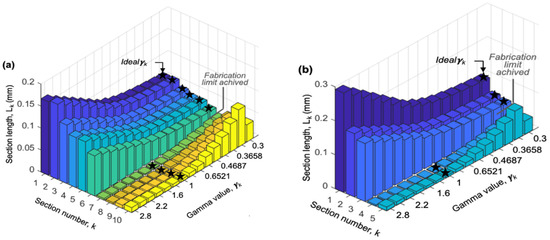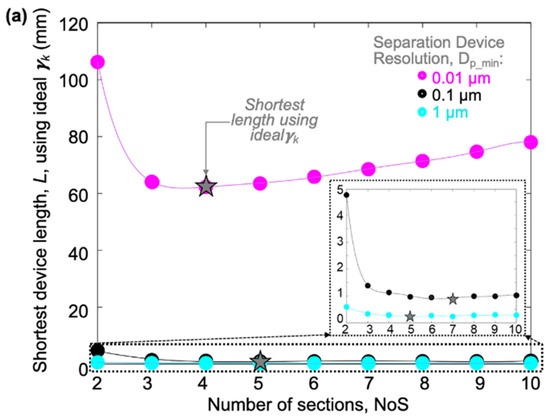 This analysis was repeated for applications such as blood separation, to analyze a variety of biological particles that require a 1 µm separation resolution while maintaining the 11 size fractions. Figure 9a shows the simulation results for this case (Dp_min = 1 µm and NoS = 10), where the specific section that reaches the fabrication limit is indicated. In Figure 9a, the smallest section length, Lk_min, marked by a star, can be achieved by selecting the equal to 1 for a k > 6 and a less than 1 for a k ≤ 6. Comparing these results to the example case in Figure 8, we see that changing the device resolution, Dp_min, will change the ideal sectional γk. The ideal sectional γk was also observed to be a function of the NoS, as shown in Figure 9b where the NoS was decreased to five while keeping the Dp_min at 1 µm.