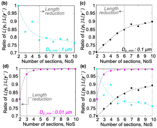 (a) Plots the of L vs. NoS for circle-shaped pillars with fabrication limits; different Dp_min values highlight important regions of consideration; (b–e) Plots of the L()/L(γ’) ratio vs. the NoS for 1 µm fabrication limit (gk_fablim = wk_fablim = 1 µm) at different device resolutions, where L() is the minimum length using the ideal gamma per section, while L(γ’) is the minimum length using the same gamma across all sections.