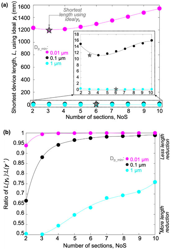 Because the ideal sectional γk can vary depending on the number of sections and device resolution, we set our model to look for the shortest device length when the ideal sectional γk is selected for different values of the NoS and Dp_min. Figure 10a shows the results of the shortest device length by adding the shortest section lengths together as a function of the NoS. In general, the total device length can be dramatically decreased by the proper choice of the NoS. From the inset in Figure 10a, results show that increasing the device resolution, Dp_min, will not necessarily increase the device length significantly, if the ideal sectional γk is selected for each section separately.