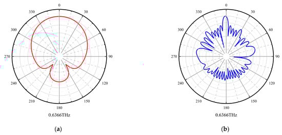 Figure 10 shows the radiation pattern of the antenna at 0.6366 THz, 0.6622 THz, and 0.6772 THz; Figure 10a,c,e is the XOZ plane, and Figure 10b,d,f is the YOZ plane.