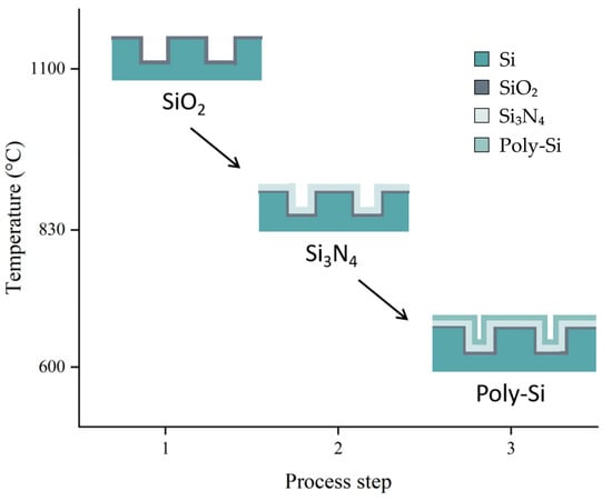 Simplified schematic of manufacturing process. Si substrate; SiO2 layer deposition at 1100 °C; Si3N4 layer deposition at 830 °C; Poly-Si layer deposition at 600 °C.